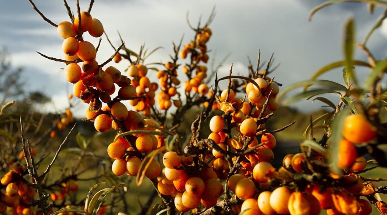 duindoorn 2De duindoorn (Hippophae rhamnoides) is een tweehuizige struik en komt in Nederland van nature vooral voor in open, kalkrijke duinen. De bessen zijn zuur en rijk aan vitamine C, vitamine E carotenoïden, flavonoïden, plantensterolen, lignanen en mineralen. In de winter kunnen de bessen gaan gisten, hierdoor kunnen vogels als de spreeuw, lijster en kramsvogel dronken worden.